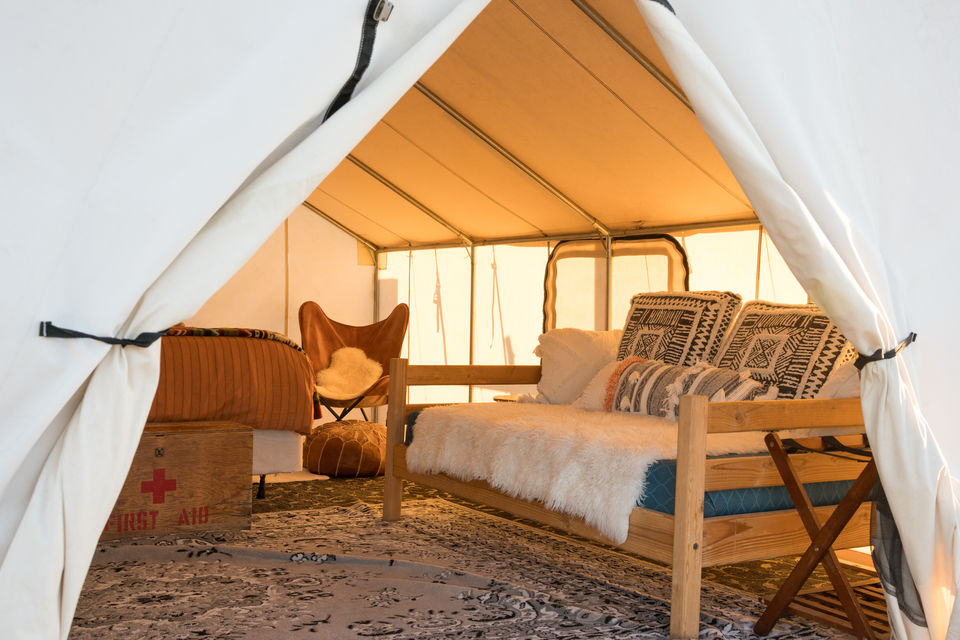 Sprawling vortex of vintage campers and tents in far west Marfa, Texas